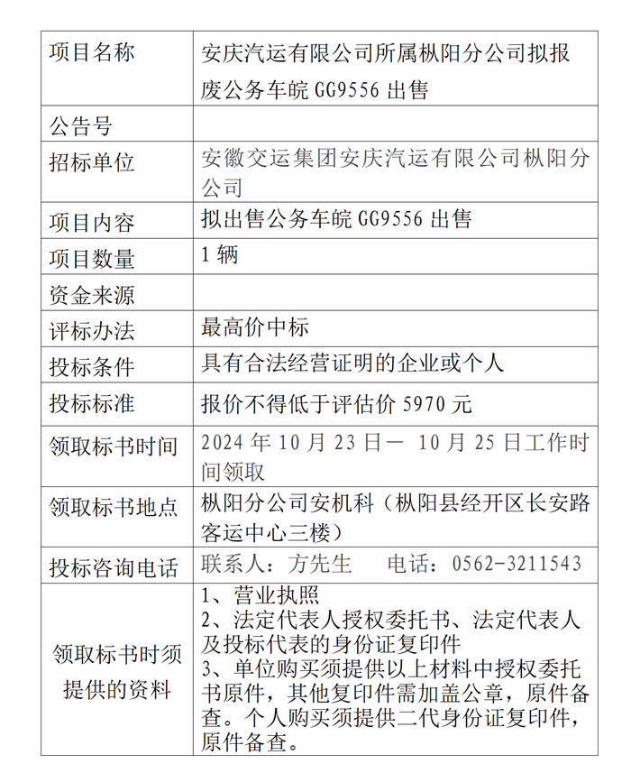 樅陽(yáng)分公司擬報(bào)廢公務(wù)車皖GG9556出售公告